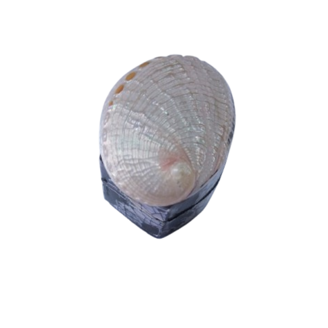 Dit lichte abalone schelpendoosje is met zorg met de hand gemaakt uit een natuurlijke schelp. De buitenkant heeft een subtiele parelmoerglans die zacht oplicht in het licht, terwijl de binnenzijde is afgewerkt met zwart fluweel.